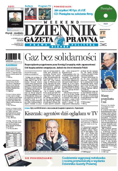 Rozporządzenie w sprawie gazu przygotowane przez Komisję Europejską gwarantuje bezpieczeństwo Unii Europejskiej ale nie chroni interesów Polski; Czesław Kiszczak, były szef MSW mówi o niszczeniu akt bezpieki i sprawie ks. Popiełuszki; wiadomo już, kto obsadzi nowe kluczowe unijne stanowiska; na leki przeciwko grypie Polacy wydadzą w tym roku 1,5 miliarda złotych; dzięki nowym przepisom firmom trudniej będzie unikać wypłaty nadgodzin; Polacy nie dbają o swoje wynalazki i znaki firmowe.