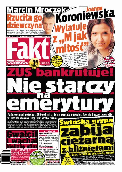 Polski system emerytalny się zawalił, ZUS wypłaca świadczenia na kredyt ale ma pieniądze na utrzymywanie wielkich nieruchomości; marszałek mazowiecki Adam Struzik to pirat drogowy łamiący nagminnie przepisy; jak bawią się polscy posłowie; dramatyczna opowieść zgwałconej kobiety; w Koninie młody mężczyzna zginął od podmuchu jadącego pociągu; Marcin Mroczek został ukarany za swoją próżność, rzuciła go dziewczyna.