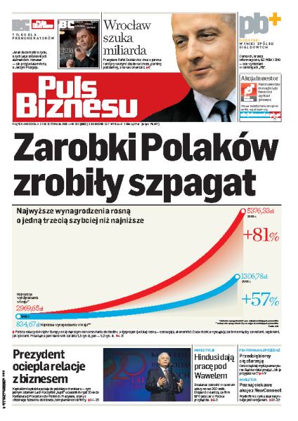 W Polsce najwyższe wynagrodzenia rosną o jedną trzecią szybciej niż najniższe; hinduska firma Intelenet chce uruchomić w Krakowie centrum usług; Wrocław liczny na to, że prywatny partner pomoże mu przeprowadzić kluczowe inwestycje, szacowane na miliard złotych; 75 proc. Polaków chce mieć kolektory słoneczne w swoich domach; niezależne domy mediowe łączą swoje siły; jak wygląda polski biznes w 20 lat po przemianach ustrojowych.