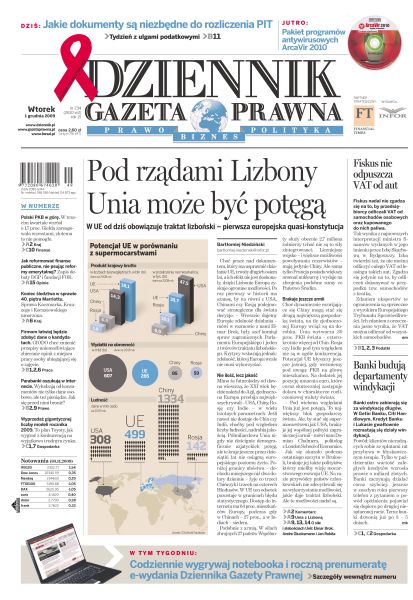 W UE od dziś obowiązuje traktat lizboński - pierwsza europejska quasi-konstytucja; polski PKB znów najwyższy w Europie; w Warszawie odbędzie się dziś demonstracja funkcjonariuszy przeciwko cięciom budżetowym; polska spóźni się z unijną nowelizacją ustawy medialnej; NFZ oszczędza na domowej opiece pielęgniarskiej; prezydent USA chce zwiększyć amerykański kontyngent i poprosić o posiłki sojuszników, w tym Polskę; mnożą się teorie na temat odpowiedzialności za piątkową eksplozję na pokładzie „Newskiego Ekspresu”; jak reformować finanse publiczne, nie psując reformy emerytalnej.