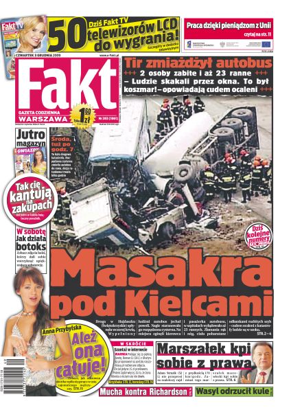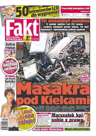 W strasznym wypadku w Hajdaszku pod Pińczowem zginął kierowca i pasażer autobusu; marszałek mazowiecki Adam Struzik jeździ jak pirat, nie zważając na przepisy, a potem kpi sobie z prawa i policji; Elżbieta Kruk z PiS zamiast pojechać do pracy w Sejmie, buszowała po butikach; pana Feliksa znaleziono martwego obok cielska wielkiego wykrwawionego odyńca; jak Anna Przybylska cieszy się z nowej fryzury; w Anglii od kilku tygodni akcje Kuszczaka, Fabiańskiego i Szczęsnego idą ostro w górę; szefowie Wisły nie chcą porozmawiać z Mauro Cantoro o jego przyszłości.