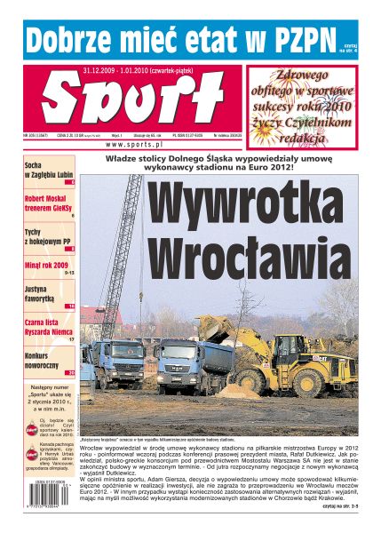 Władze stolicy Dolnego Śląska wypowiedziały umowę wykonawcy stadionu na Euro 2012; wizualizacja Stadionu Narodowego w Chorzowie pokazuje konieczność dokonania zmian w obecnej przestrzeni architektonicznej „śląskiego giganta”; blisko pięciomilionową dziurę w budżecie na rok 2010 zaplanowali związkowi działacze PZPN; Bogdan Wenta wybrał „19” na ostatnie zgrupowanie przed ME; Kamil Stoch będzie miał w Ga-Pa okazję udowodnić, że wpadka w Oberstdorfie była jedynie wypadkiem przy pracy.