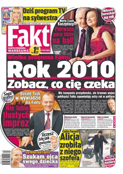 Maria i Lech Kaczyńscy jadą ze znajomymi do tajemniczego miejsca z dala od stolicy; Donald Tusk skromnego sylwestra spędzi z żoną u swoich przyjaciół; szwedzkie media podają, że to neonazista zlecił kradzież napisu w obozie Auschwitz; Edyta Górniak dostała mniejszą garderobę niż Kasia Cichopek; Alicja Bachleda-Curuś cieszy się, że szczęśliwie dotarła do domu; Marcin Wasilewski chce zagrać w tym sezonie; napastnik Widzewa Marcin Robak dostał powołanie do reprezentacji, choć nie występuje w ekstraklasie; Krzysztof Hołowczyc realnie ocenia swoje szanse w tegorocznym rajdzie Dakar.