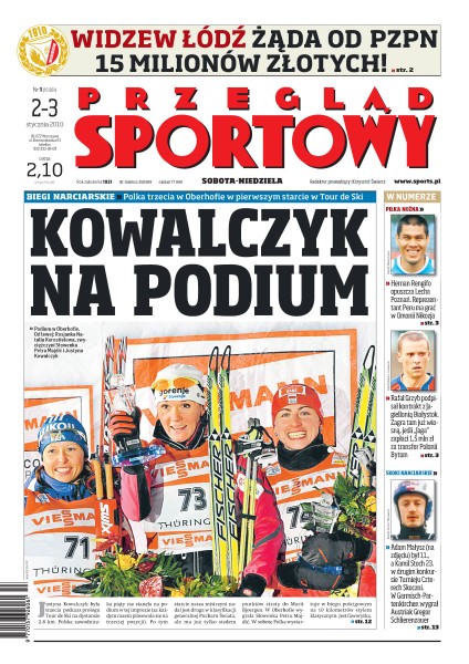 Justyna Kowalczyk trzecia podczas prologu Tour de Ski na dystansie 2,8 km, Widzew Łódź chce od PZPN 15 mln zł za przymusową grę w pierwszej lidze, subiektywne podsumowanie minionej dekady w polskiej ekstraklasie, Villareal ma szansę jako pierwszy pokonać w tym sezonie Barcelonę, statystyki ligowców: Legia ma najlepszą obronę w Europie, rekord skoczni Ga-Pa należy już do Simona Ammanna, nowy Nissan Krzysztofa Hołowczyca na rajd Dakar.