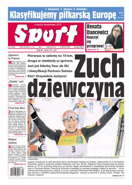 Sobotnia wygrana na 10 km w niemieckim Oberhofie to już trzecie zwycięstwo Justyny Kowalczyk w tym sezonie; Hiszpanie zakończyli eliminacje mistrzostw świata z kompletem punktów i wygrali wszystkie mecze towarzyskie; Mariusz Lewandowki zagrał we wszystkich meczach Polski w eliminacjach MŚ 2010, jednak powodów do zadowolenia nie miał; Czesi ustanowili rekord Europy, ich reprezentację prowadziło w 2009 roku aż czterech selekcjonerów; Marcin Gortat rozegrał przeciwko Minnesocie setny mecz w sezonie zasadniczym w NBA; Rafał Sonik jadący na quadzie prowadził w sobotę po pierwszym etapie Rajdu Dakar.