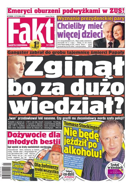 Świadek w sprawie zabójstwa gen. Marka Papały, Artur Zirajewski nie żyje; urzędnicy ZUS dostali duże podwyżki, emeryci gorsze; Lech i Maria Kaczyńscy żałują, że nie mają więcej dzieci; pan Wiesław przeżył szok, gdy zamiast mogiły mamy ujrzał betonowy pomnik z nową lastrykową płytą przygotowany na inny grób; reżyser Patryk Vega zaprosił siostrę Michaela Jacksona na swoje urodziny; Maryla Rodowicz rwie się do Afganistanu, by dać tam koncert; Łukasz Sosin i Ebi Smolarek ruszają na podbój ligi greckiej; austriaccy skoczkowie kombinują z kombinezonami.