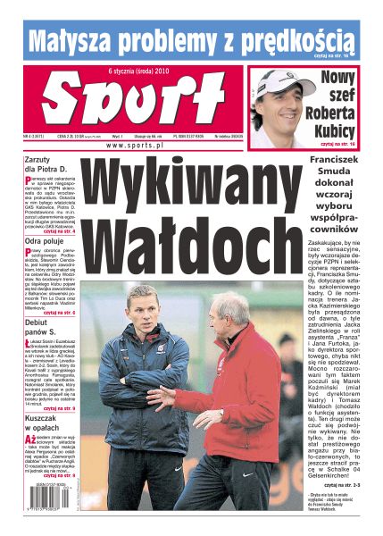 Zaskakujące były wczorajsze decyzja PZPN i selekcjonera reprezentacji, Franciszka Smudy, dotyczące sztabu szkoleniowego kadry; wśród trzydziestu golkiperów, którzy jesienią zaprezentowali się na ligowych boiskach, znalazło się 24 Polaków i 6 obcokrajowców; aż siedem zmian w wyjściowym składzie - taka może być reakcja Alexa Fergusona po ostatniej wpadce „Czerwonych diabłów” w Pucharze Anglii; gabaryty i siła ciosów Tomasza Adamka są coraz większe; Jekaterina Gamowa, rosyjska wieża, dumnie patrzyła na bielszczanki nie tylko ze względu na wzrost, ale przede wszystkim umiejętności; po zatankowaniu na jednej ze stacji benzynowych wielu uczestników Rajdu Dakar miało na trasie problemy.