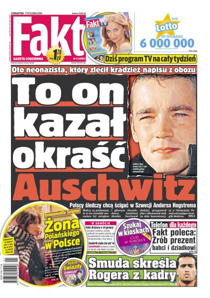 W Europie zarabiamy najmniej, za to za paliwo płacimy najwięcej; szwedzki neonazista Anders Hogstrom zlecił haniebną kradzież napisy „Arbeit Macht Frei”; Aleksander Kwaśniewski z żoną spędza ferie w Davos; ekonomiści ostrzegają, że w tym roku w Polsce znacznie wzrośnie bezrobocie; tajemniczy mord w kołobrzeskim porcie; Cezary pazura nie dostaje zbyt wielu nowych ról, więc wziął się za produkcję filmów; żona Romana Polańskiego, Emmanuelle Seigner, przyjechała do Polski, żeby zagrać w nowym filmie; Justyna Kowalczyk w Cortina d'Ampezzo była trzecia na dystansie 16 kilometrów.