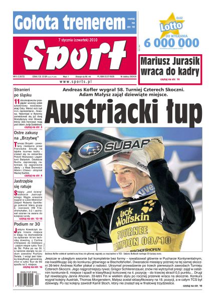 Andreas Kofler wygrał 58. Turniej czterech Skoczni - Adam Małysz zajął dziewiąte miejsce; wczoraj szkoleniowcy Odry Wodzisław wzięli pod lupę 12 nowych zawodników; działacze Ruchu Chorzów zaprzeczają doniesieniom o zagranicznych ofertach dla Macieja Sadloka; Andrzej Gołota ma przylecieć do Polski w przyszłym tygodniu, by debiutować w roli trenera amatorów z USA; Carlos Sainz zmieniał przebite koło, stracił dwie minuty i zajął drugie miejsce na etapie, ale prowadzi w klasyfikacji generalnej Rajdu Dakar; Mariusz Jurasik wraca do reprezentacji piłki ręcznej; piąty etap Toue de Ski przyniósł zmianę liderki, jednak Polka wciąż jest główną faworytką do końcowego triumfu.