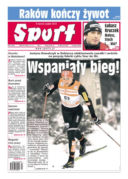 Justyna Kowalczyk w Dobiacco zdeklasowała rywalki i wróciła na pozycje liderki cyklu Tour de Ski; czy Arkadiusz Onyszko zagra w ostatniej w tabeli ekstraklasy Odrze; dwaj Brazylijczycy, Bośniak i Słowak wzbudzali zainteresowanie na wczorajszym treningu Polonii Bytom; szesnaście najlepszych drużyn zjechało do Angoli, by rywalizować o miano najlepszej drużyny kontynentu; jak daleko Adam Małysz doleci na Igrzyskach w Vancouver; w ostatniej rundzie Ligi Mistrzów nasi siatkarze stanęli na wysokości zadania; Jakub Przygoński awansował na 15 miejsce w klasyfikacji generalnej Rajdu Dakar.