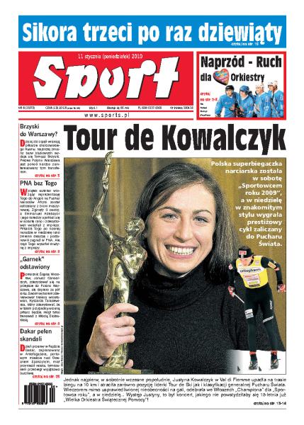 Pomimo upadku, Justyna Kowalczyk w fantastycznym stylu wygrała Tour de Ski; Sławomir Peszko został wybrany najlepszym piłkarzem Wielkopolski w minionym roku; czternastu zagranicznych piłkarzy z kilku kontynentów zagrało w sobotnim meczu sparingowym Odry Wodzisław; Tomasz Kuszczak po wspaniałym występie w meczu z Birmingham nie był zadowolony z przebiegu całego spotkania; Urszula Radwańska na trzeciej rundzie eliminacji zakończyła swój udział w pierwszym dla niej w tym sezonie turnieju WTA.