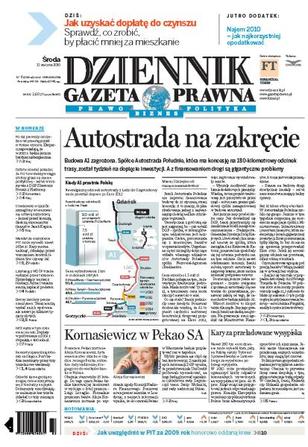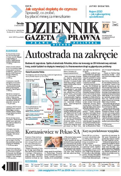 Budowa autostrady A1 jest mocno zagrożona, spółce Autostrada Południe, która ma koncesję na 180-kilometrowy odcinek trasy, został tylko tydzień na dopięcie inwestycji; prezesem Pekao zostanie Alicja Kornasiewicz, była wiceminister skarbu w rządzie Jerzego Buzka; nawet 260 tys. euro dziennie może wynieść kara, jaką nałoży na Polskę Trybunał Sprawiedliwości w Luksemburgu za wypełnione po brzegi wysypiska; po raz pierwszy od sześciu lat wzrosła w Polsce przestępczość; mandat za niezłożenie zeznania podatkowego za 2009 rok może wynieść nawet 2634 zł; licytację z WOŚP trzeba wykazać przed fiskusem.