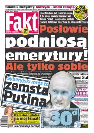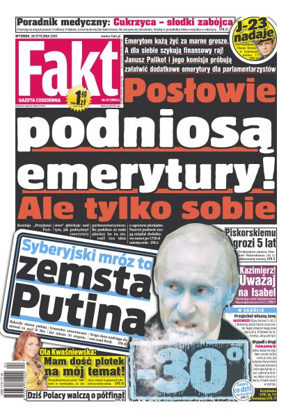 Posłowie podniosą emerytury, ale tylko sobie; według prokuratorów, Paweł Piskorski posługiwał się sfałszowanymi dokumentami; jak bawiła się władza w Ostródzie; młoda żona Kazimierza Marcinkiewicza często bywa obiektem westchnień licznych adoratorów; tej nocy padł rekord zimna w Polsce; jak Boguś na rowerze paliwo kradł; Aleksandra Kwaśniewska ma dość plotek na swój temat; dziś przed polskimi piłkarzami ręcznymi starcie z Czechami - zwycięstwo da nam awans do półfinałów mistrzostw Europy; Tomasz Adamek przytył w ciągu trzech lat ponad 20 kilogramów.