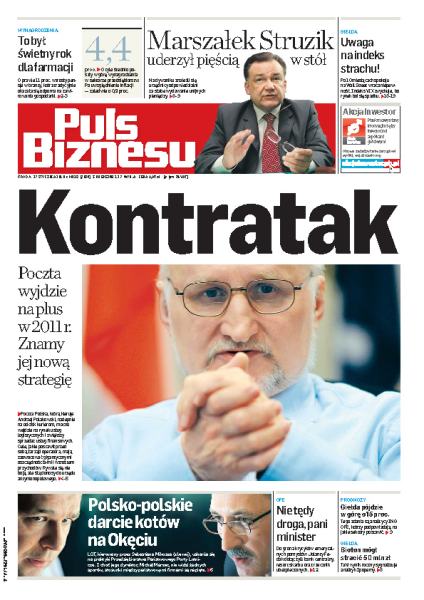 Poczta Polska, którą kieruje Andrzej Polakowski, zamierza nadepnąć na odcisk kurierom, zarząd operatora planuje wejść w rynek usług logistycznych i zwiększyć sprzedaż usług finansowych; w 2009 roku spadły pensje w wielu branżach, jednak farmaceuci zyskali największe podwyżki; LOT twierdzi, że Państwowe Porty Lotnicze utrudniają mu działalność; na Mazowszu wrze z powodu słabych wyników w wydawaniu pieniędzy z UE; armia przeciwników reformy OFE, przygotowanej przez resort pracy, rośnie w siłę – wczoraj wstąpił do niej Aleksander Grad, minister skarbu.