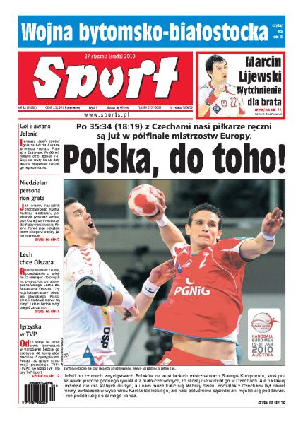 Po wygranej z Czechami 35:34 nasi piłkarze ręczni po raz pierwszy w historii awansowali do półfinału mistrzostw Europy; Andrzej Niedzielan powinien rozpocząć poszukiwania nowego klubu, gdyż w składzie Polonii Warszawa nie ma już dla niego miejsca; czterech nowych piłkarzy podpisze kontrakty z Odrą Wodzisław; Lech Poznań chce pozyskać Sebastiana Olszara; wywiad z Marcinem Lijewskim; Igrzyska Olimpijskie zdominują telewizję publiczną.