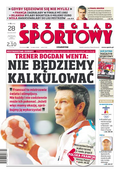 Selekcjoner reprezentacji Polski piłkarzy ręcznych przed ostatnim meczem grupowym z Francją nie zamierza kalkulować; prezentacja kilka subiektywnych przykładów, gdzie błędy sędziów wypaczyły nie tylko wynik meczu, ale i de facto zmieniły biegi dziejów; w półfinałach Pucharu Narodów Afryki pasjonująco zapowiada się przede wszystkim mecz Egiptu z Algierią; wywiad z Pawłem Brożkiek, napastnikiem Wisły Kraków; związkowa władza zignorowała żądania Widzewa mające złagodzić finansowe skutki decyzji o karnej degradacji łodzian; z turnieju Australian Open pożegnał się pogromca Łukasza Kubota Serb Novak Dżoković; na igrzyska do Kanady pojedzie 46 olimpijczyków.