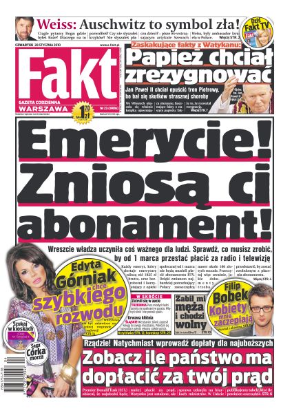 Jan Paweł II chciał opuścić tron Piotrowy, bo bał się skutków strasznej choroby; co trzeba zrobić, by od 1 marca przestać płacić za radio i telewizje; w 65. rocznicę wyzwolenia obozu koncentracyjnego w Auschwitz byli więźniowie wspominali swój straszliwy los; Edyta Górniak i Dariusz Krupa liczą, że ich rozwód skończy się tylko na jednej rozprawie; dlaczego Polaków nie stać na usługi bankowe; piłkarze ręczni płacą wysoką cenę za sukcesy na mistrzostwach Europy; mimo kryzysu do Kanady poleci liczna ekipa telewizyjnych komentatorów; Kowalczyk, Małysz, Sikora - to na ich sukcesy najbardziej liczą Polacy podczas igrzysk w Vancouver.
