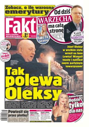 Józef Oleksy w wielkim stylu wrócił na łono Lewicy - wznosił toasty i nalewał swym partyjnym towarzyszom; tabela planowanych podwyżek od marca tego roku aż do 2015; nieznane fakty w sprawie zabójstwa Krzysztofa Olewnika - media ujawniły, że w dniu przywiezienia zwłok tajemnicza osoba weszła do prosektorium; stara hałda w Piekarach Śląskich żywi 80 ubogich rodzin; kończą się pieniądze na utrzymanie złapanej na Podkarpaciu niedźwiedzicy; dramat Martyny Wojciechowskiej - podróże zniszczyły jej twarz; Joanna Krupa chce być wzorem dla modelek; 40-letni Edwin van der Sar po tym sezonie skończy karierę i zwolni miejsce w bramce Tomaszowi Kuszczakowi.