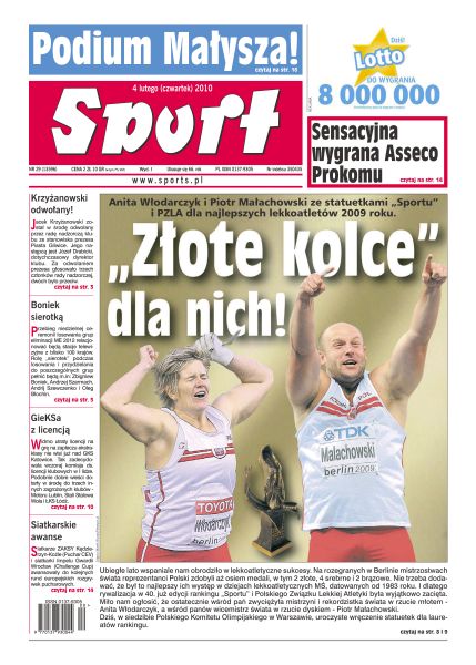 Anita Włodarczyk i Piotr Małachowski ze statuetkami „Sportu” i PZLA dla najlepszych lekkoatletów 2009 roku; Franciszek Smuda zapewnia, że u niego zawsze na pierwszym miejscu będzie dyscyplina i w reprezentacji żadnych afer nie będzie; Michał Zieliński od 1 lipca będzie zawodnikiem Korony Kielce; w niedzielę odbędzie się losowanie mistrzostw Europy 2012 w Sali Kongresowej PKiN w Warszawie; na Wyspach Brytyjskich wszystko jest możliwe - również to, że 30-letni stoper zdobywa 3 bramki w ciągu 6 minut; reprezentacja naszych tenisistek intensywnie trenuje w Bydgoszczy przed meczem I rundy Grupy Światowej II Fed Cup z Belgią; Adam Małysz zajął drugie miejsce w konkursie Pucharu Świata w Klingenthal.