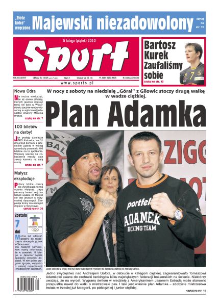 W nocy z soboty na niedzielę Tomasz Adamek stoczy drugą walkę w wadze ciężkiej z Jasonem Estradą; Paweł Brożek po ponad 2 miesięcznej przerwie wznowił treningi; kontrakty z Odrą podpisała rekordowa liczba ośmiu zawodników, a będą jeszcze następni; działacze katowickiego klubu obliczyli, że spotkanie GKS - Górnik mogłoby zobaczyć nawet 40 tysięcy ludzi; z 16 selekcjonerów prowadzących reprezentację w finałach Euro 2008 pozostało na stanowiskach tylko pięciu; pod nieobecność Piotra Małachowskiego statuetkę dla głównego laureata odebrał drugi w rankingu za 2009 rok, Tomasz Majewski; Bartosz Kurek podpisał czteroletni kontrakt z bełchatowską Skrą; Justyna Kowalczyk od ponad tygodnia aklimatyzuje się w Kanadzie.