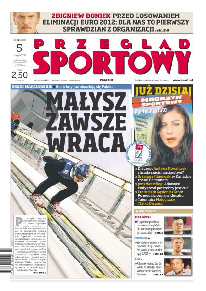 Jutro w Auli Głównej Politechniki Warszawskiej kolacja na 600 osób, dzień później w Pałacu Kultury losowanie grup eliminacyjnych; wywiad ze Zbigniewem Bońkiem, polskim ambasadorem Euro 2012; trener Skorża w inauguracyjnym meczu rundy rewanżowej może nie mieć w drużynie ani jednego napastnika; wywiad z Fernando Llorente, napastnikiem reprezentacji Hiszpanii i Athletic Bilbao; ostatni udany występ Adama Małysza w niemieckim Klingenthal to kolejny wielki powrót mistrza przed najważniejszymi zawodami w sezonie; Justyna Kowalczyk przed igrzyskami pracuje nad siłą; Asseco Prokom jest już bardzo blisko ćwierćfinału Euroligi.