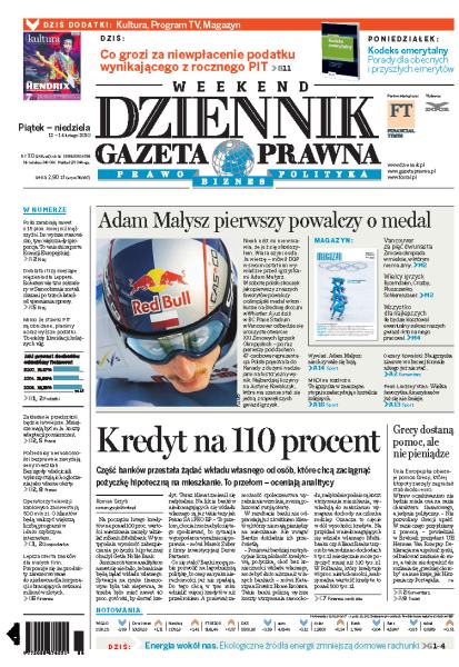 Już w sobotę Adam Małysz jako pierwszy z naszych faworytów powalczy o medale olimpijskie w Vancouver; część banków przestała żądać wkładu własnego od osób, które chcą zaciągnąć pożyczkę hipoteczną na mieszkanie; w Polsce kobiety zarabiają średnio o 15 proc. mniej niż mężczyźni; w okresie 18 lat obowiązywania ustawy o PIT liczba formularzy zeznania rocznego podwoiła się; resort edukacji chce zmienić zasady przeprowadzania konkursów na dyrektorów szkół; osoby, które dotychczas za wszelką cenę unikały komisji wojskowej teraz próbują dostać się do armii; jakie są konsekwencje niepłacenia podatków.