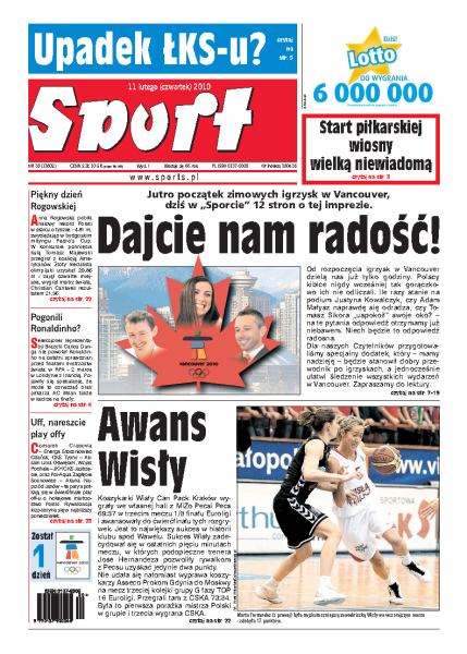 Już jutro początek zimowych igrzysk w Vancouver, dowiedz się wszystkich szczegółów o organizacji imprezy i startach Polaków; bardzo możliwe, że start piłkarskiej rundy wiosennej zostanie przeniesiony o kilka dni; Ruch Chorzów ma wymarzone warunki do gry i treningu; w lidze angielskiej sędziowie popełniają coraz więcej błędów; koszykarki Wisły Can-Pack Kraków awansowały do najlepszej ósemki Euroligi.