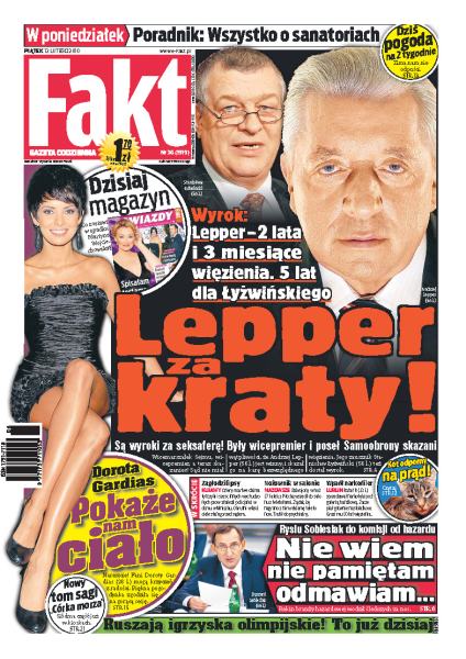 Publicyści i dziennikarze komentują przesłuchanie Ryszarda Sobiesiaka w Sejmie przed hazardową komisją śledczą; Andrzej Lepper i Stanisław Łyżwiński z Samoobrony zostali skazani na 2 i 5 lat więzienia; minister Ewa Kopacz oficjalnie namawia do rzucenia papierosów a sama pali i jest przeciwna zakazom dla palaczy; staruszka mogła stracić życie tonąc w wielkiej zaspie śniegu; Edyta Górniak zrezygnowała z występu w wielkim show.