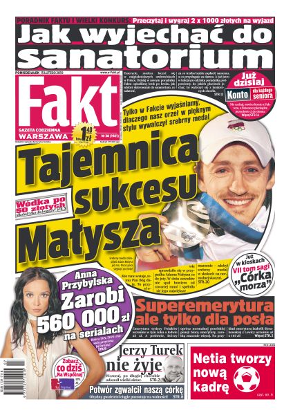 Na marcowej waloryzacji najbardziej zyskają ci, którzy już teraz dostają spore wypłaty z ZUS - czyli między innymi politycy z wiejskiej; były minister, Mirosław Drzewiecki, zapomina o kłopotach związanych z aferą hazardową grając w golfa na Florydzie; Unia domaga się, aby alkohol był droższy; Bronisław Komorowski może kandydować na urząd prezydenta - dostał już zgodę małżonki; czy policjanci złapią wreszcie bestialskiego oprawcę kobiet; ramię olbrzymiego dźwigu zabiło dwóch robotników na budowie; płynie pomoc dla córeczek Andrzeja Struja, policjanta bestialsko zamordowanego przez chuliganów; Adam Małysz wywalczył srebrny medal olimpijski na normalnej skoczni.