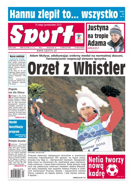 Adam Małysz, zdobywając srebrny medal na norweskiej skoczni, fantastycznie rozpoczął zimowe igrzyska; Justyna Kowalczyk rozpoczyna dziś walkę o medale; Chelsea pewnie awansowała do ćwierćfinału Pucharu Anglii; Cristiano Ronaldo powrót na boisko po dyskwalifikacji zaznaczył dwoma bramkami; Ronaldinho został pominięty przy nominacjach do reprezentacji z powodu słabej formy; koszykarze AZS AWF Katowice pokonali tyszan i przerwali serię siedmiu porażek z rzędu; Mecz Gwiazd Północy i Południa był wielką zabawą, a kilka tysięcy widzów raz po raz entuzjastycznie przyjmowało każde niekonwencjonalne zagranie; Łukasz Kubot w nocy walczył o zwycięstwo w singlu i deblu w turnieju Costa de Sauipe.