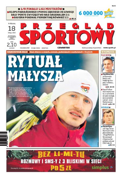 Po bardzo dobrych startach Justyna Kowalczyk awansowała do finału sprintu i walczyła o medal; wywiad z Adamem Małyszem na temat jego snów, stresie, pomnikach i rozmowach z Bogiem; prawdziwa historia Sławomira Peszki; życiowy sukces Eweliny Staszulonek, dwa lata po wypadku jest ósma w igrzyskach olimpijskich; dziś kolejny start Tomasza Sikory, Polak liczy na sukces; FC Porto wygrało z Arsenalem Londyn 2:1.