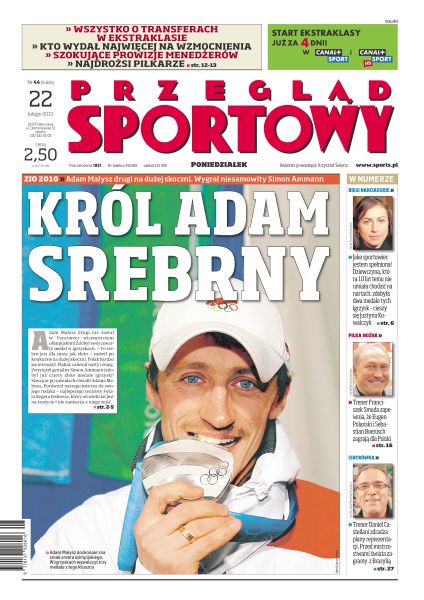 Adam Małysz drugi raz został w Vancouver wicemistrzem olimpijskim; po pasjonującym finiszu Justyna Kowalczyk zdobyła brąz w biegu łączonym; Tomasz Sikora dobrze pobiegł, ale strzelał kiepsko - w ostatnim starcie zajął 11. miejsce; Weronika Nowakowska sprawiła największą niespodziankę w polskiej reprezentacji; ile wydały kluby ekstraklasy na wzmocnienia w przerwie zimowej 2009/2010; Barcelona błyskawicznie otrząsnęła się po porażce sprzed tygodnia; wywiad z Michałem Winiarskim, przyjmującym PGE Skry Bełchatów; rzeszowianie po raz drugi przegrali z ZAKS-ą i stracili na kilka dni fińskiego atakującego; Robert Kubica jest zadowolony po testach bolidu Renault na torze w Jerez.