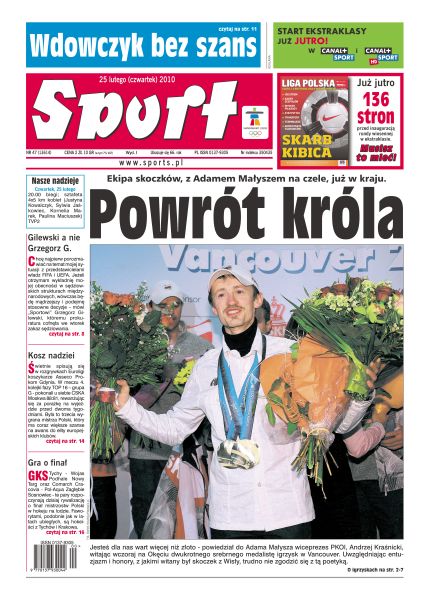 Dla Justyny Kowalczyk dzisiejszy bieg sztafetowy ma być tylko przetarciem przed rywalizacją w sobotę; po dobrych startach w konkurencjach szybkościowych, Agnieszka Gąsienica-Daniel nie ukończyła slalomu giganta; ekipa skoczków, z Adamem Małyszem na czele, jest już w kraju; trener Ruchu Chorzów, Waldemar Fornalik, nie przywiązuje wielkiej wagi do wyników sparingów; Argentyńczyk Diego Milito już w 3. minucie znalazł sposób na pokonanie bramkarza Petra Čecha; już 23 gole w tym sezonie ma na koncie Wayne Rooney; po zwycięstwie nad CSKA Moskwa, już tylko krok dzieli gdynian od awansu do grona ośmiu najlepszych zespołów Europy.