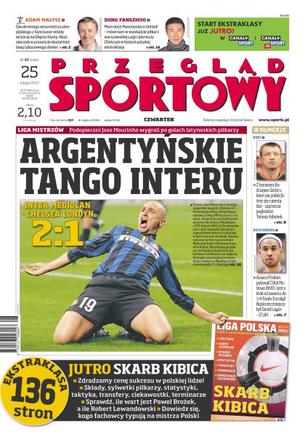 Podopieczni Jose Murinho wygrali po golach latynoskich piłkarzy; kilkaset osób witało Adama Małysza na warszawskim Okęciu; Justyna Kowalczyk tłumaczy, czemu w sztafecie pobiegnie dziś na drugiej zmianie; wywiad z Karoliną Riemen, 16. zawodniczką skicrossu; do następnej walki Tomasz Adamek będzie się przygotowywał bez Andrzeja Gmitruka; w Eurolidze Asseco Prokom okazał się lepszy od CSKA Moskwa; o wygranej Interu nad Chelsea zdecydowały gole Argentyńczyków; wywiad z Dongiem Fangzhuo, pierwszym Chińczykiem w polskiej lidze.