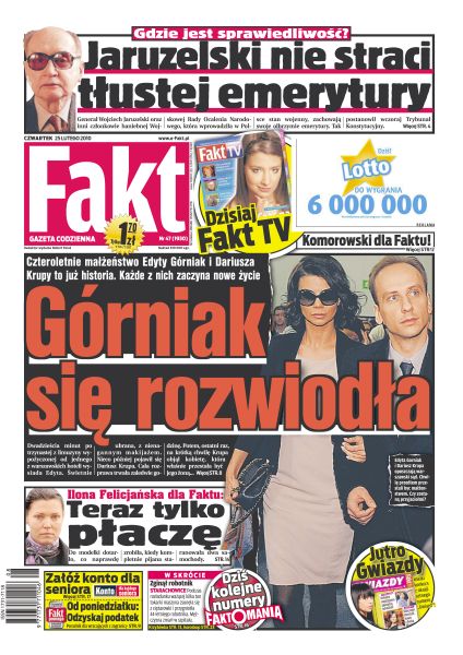 Czteroletnie małżeństwo Edyty Górniak i Dariusza Krupy to już historia; sędziowie Trybunału Konstytucyjnego uznali wczoraj, że odebranie byłym esbekom emerytur jest zgodne z prawem; państwo Kwaśniewscy udowodnili, że nawet spacer z psami może być wydarzeniem; Kazimiera Olczyk 25 razy zdawała prawo jazdy; Ilona Felicjańska zdaje sobie sprawę ze swojego bezmyślnego zachowania; Paulla Ignasiak pokazała na co ją stać; Eusebio Sacristan wspomina wspólną grę w Barcelonie z trenerem Polonii; Justyna Kowalczyk upadła na treningu, ale nie zrezygnuje ze startów.