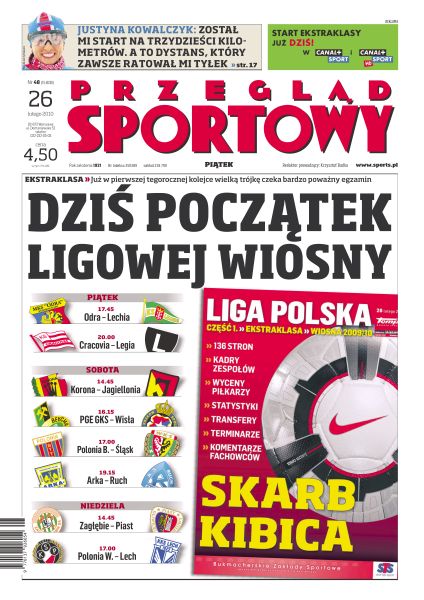 Już w pierwszej tegorocznej kolejce Ekstraklasy wielką czwórkę czeka bardzo poważny egzamin; wywiad z Grzegorzem Mielcarkiem, byłym reprezentantem Polski, obecnie ekspertem Canal+; na powitanie piłkarskiej wiosny prezentacja subiektywnej listy największych dziwactw w naszym futbolu; działacze Schalke i Borussii Dortmund błagają kibiców o spokój na trybunach; Kanadyjczycy rozbili Rosjan 7:3 w ćwierćfinale turnieju olimpijskiego, czym wprawili w euforię swoich kibiców; wywiad z Justyną Kowalczyk, srebrną i brązową medalistką igrzysk w Vancouver; polska sztafeta zajęła wysoką szóstą pozycję; Wisła Can-Pack może dziś awansować do Final Four Euroligi.