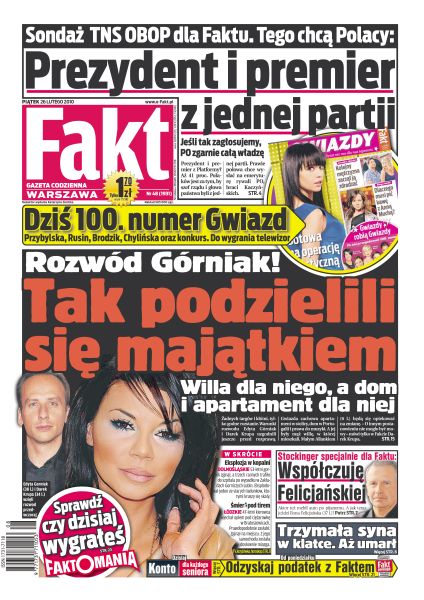 Czy po jesiennych wyborach prezydenckich Platforma Obywatelska będzie niepodzielnie rządzić krajem; Wojciech Jaruzelski nie zamierza rezygnować z prezydenckich przywilejów; Ilona Felicjańska długo nie zasiądzie za kierownicą swojego auta; małżeństwo Edyty Górniak i Dariusza Krupy to od dwóch dni już przeszłość; porażka Legii w Krakowie już na starcie rozwieje marzenia kibiców ze stolicy; w sobotę Justyna Kowalczyk pobiegnie na 30 km stylem klasycznym - dystansie, na którym w tym sezonie jest najlepsza na świecie.