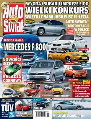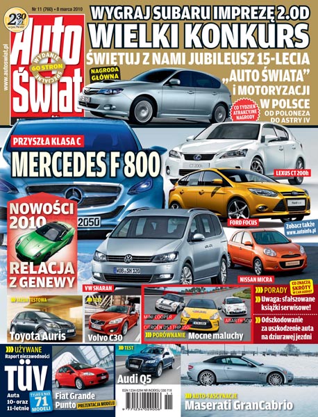 Jubileusz 15-lecia "Auto Świata" i wielki konkurs z nagrodą w postaci Subaru Imprezy 2.0D; Mercedes F800, czyli przyszła klasa C; relacja z salonu samochodowego w Genewie: Lexus CT 200h, Ford Focus Combi, Volkswagen Sharan, Mitsubishi ASX, KIA Sportage, Infiniti M, Nissan Micra; jazda testowa Toyotą Auris po liftingu; Formuła 1 gotowa do startu; porównanie mocnych maluchów: Mini Cooper, Citroen DS3 THP 150, Abarth 500; test Audi Q5 3.0 TDI; test Volvo C30 T5; test VW Scirocco 2.0 TSI R-Line; uwaga na sfałszowane książki serwisowe; odszkodowanie za uszkodzenie auta na dziurawej drodze; radio od A do Z; używane: Fiat Grande Punto; raport niezawodności TUV - samochody 10- i 11-letnie; auto-fascynacje: Maserati GranCabrio.