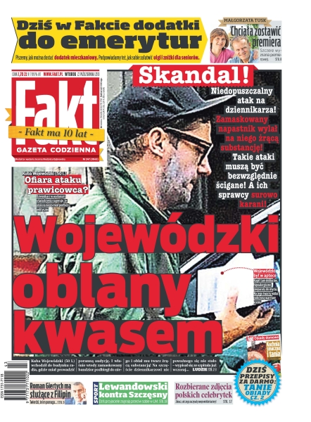 Wojewódzki oblany kwasem; nagrody w rządzie coraz wyższe; jak dostać dodatek mieszkaniowy; premierowa nie ukrywa, że w jej małżeństwie były sytuacje kryzysowe; Giertych ma służące z Filipin; wielki kant z wiejskimi jajami; bomba z internetu zabiła ucznia; czy to koniec wojny Górniak z Kozyrą; jak wielkie celebrytki zaczynały swoje kariery; Szczęsny kontra Lewandowski – starcie kumpli; w Stambule rozpoczynają się mistrzostwa WTA – do wygrania jest prawie 7 milionów złotych; gdzie się podziała Iga Wyrwał.