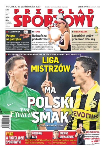 Szczęsny kontra Lewandowski – Arsenal gra w Londynie z Borussią; w dwunastej kolejce piłkarze zdobyli aż 36 bramek, średnio 4,5 w meczu; Jagiellonia pokonała Śląsk 1:0 i zagra w ćwierćfinale, ale straciła Jana Pawłowskiego; jeśli Agnieszka Radwańska chce awansować do półfinału, musi znaleźć obronę przed mocno atakującymi rywalkami; Jastrzębski Węgiel rozpoczyna dziś udział w elitarnych rozgrywkach; od miesięcy walczą na słowa – być może Artur Szpilka i Krzysztof Zimnoch wreszcie wejdą razem do ringu; wysocy zawodnicy F1 mają problemy ze znalezieniem pracodawcy na przyszły rok – to efekt zmian regulaminu, które sprawią, że bolidy będą cięższe.