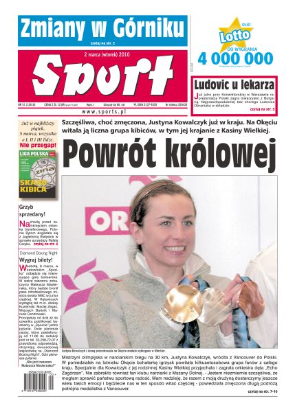 Szczęśliwa, choć zmęczona, Justyna Kowalczyk jest już w kraju - na Okęciu witała ją liczna grupa kibiców, w tym jej krajanie z Kasiny Wielkiej; Ludovic Obraniak przybywa do Warszawy chory, wiele wskazuje na to, że w środowym spotkaniu przy Konwiktorskiej nie wystąpi; w tym sezonie największą bolączką trenerów pracujących na Bogumińskiej jest brak rasowego napastnika i lewego obrońcy; prezes PKOl powiedział, że za występ Polaków na igrzyskach w Vancouver wystawiłby piątkę; gol Sidneya Crosby jest najważniejszym w historii kanadyjskiego hokeja; Sebastian Pęcherz, przyjmujący Jastrzębskiego Węgla, w sobotę znów stanie w kwadracie dla rezerwowych.