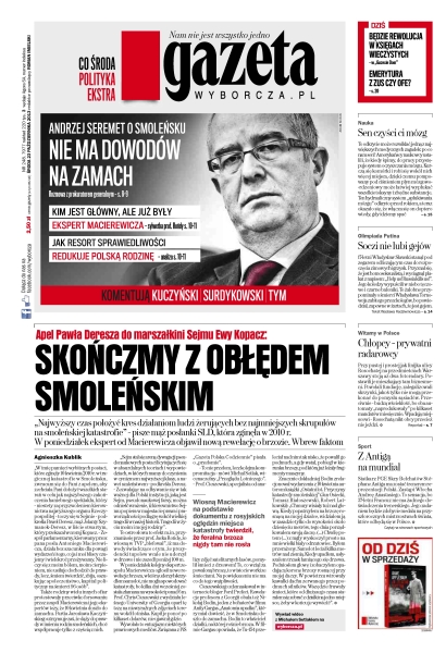Sojusz PSL i SLD pokrzyżuje plany PO, która chce odebrać partiom publiczne pieniądze; dlaczego w warszawskich Alejach Jerozolimskich nie ma ani jednego fotoradaru, a na peryferyjnej uliczce Rosochatej aż dwa; prokuratorzy nie znaleźli dotąd niczego, co mogłoby potwierdzić tezę o zamachu w Smoleńsku; Jacek Rońda jednym występem w Telewizji Trwam zakończył swoją karierę w zespole smoleńskim Antoniego Macierewicza; grecki parlament postanowił pozbawić finansowania z budżetu państwa skrajnie prawicową partię Złoty Świt; olimpijskie Soczi nie lubi gejów; od piątku w kinach „Piąta władza” Billa Condona – dobry film o kulisach Wikileaks; rząd przedstawił projekt ustawy o zmianach w systemie emerytalnym; rewolucyjne ułatwienia w dostępie do ksiąg wieczystych opóźnią się aż o siedem miesięcy; Stéphane Antiga, przyjmujący PGE Skry Bełchatów, ma poprowadzić polskich siatkarzy na przyszłorocznym mundialu.