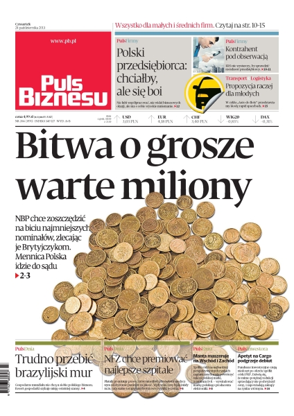 NBP chce zaoszczędzić na biciu najmniejszych nominałów, zlecając je Brytyjczykom – Mennica Polska idzie do sądu; dlaczego KRS nie wystarczy, by sprawdzić rzetelność przedsiębiorcy; w cyklu „Auto do floty” przedstawiamy Skodę Rapid Spaceback; płatnik projektuje prawo, które umożliwi placówkom medycznym zdobywanie punktów za jakość. Wpływ na notę będą miały m.in. racjonalne terapie antybiotykowe i wyniki leczenia; spółki córki na najbardziej perspektywicznych rynkach zagranicznych mają powtórzyć sukces polskiej matki, a centrum B+R; fundusze inwestycyjne czują niedosyt po ofercie spółki córki PKP.