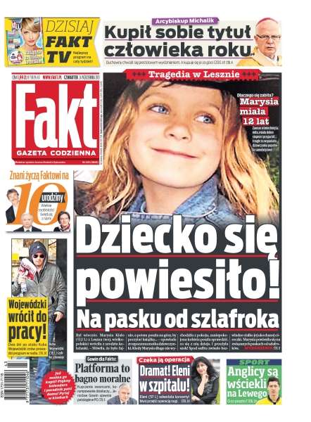 W ciągu dziewięciu miesięcy tego roku szef resortu cyfryzacji był w Brukseli pięć razy – jak twierdzi służbowo, czyli za pieniądze podatników; abp Michalik kupił sobie tytuł człowieka roku; Wojewódzki wrócił do pracy i nie chce ochrony; 10. urodziny Faktu; Eleni w szpitalu; Edyta Herbuś i Mariusz Treliński – czy ta miłość jest na pokaz; Katarzyna Skrzynecka dzięki córeczce zapomina o stresie; tylko zwycięstwo przedłuży nadzieje Legii na wyjście z grupy Ligi Europy; Michał Jonczyk przeszedł przeszczep i walczy o kontrakt; Antiga trenerem kadry siatkarzy; Agnieszka Radwańska może zakończyć sezon na najlepszej w rankingu pozycji w swojej karierze; wielkie święto w brytyjskiej rodzinie królewskiej.