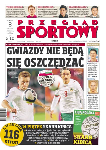 Dziś w Warszawie na stadionie Polonii odbędzie się mecz Polska – Bułgaria; Franciszek Smuda szósty raz poprowadzi kadrę Polski - kolejny eksperyment to Dariusz Dudka na lewej obronie; wywiad z Jakubem Błaszczykowskim zawodnikiem Borussii Dortmund; Sławomir Peszko w co drugim meczu jest karany przez arbitrów; Maradona całkowicie zdominował reprezentację Albicelestes - on jest najważniejszy, inni są widzami w jego teatrze; Sylwia Gruchała będzie walczyć do igrzysk w Londynie; Prokom jest o krok od ćwierćfinału - największego sukcesu w historii klubu; z połączenia najlepszych piłkarzy Polski i Bułgarii powstałby mocny zespół.