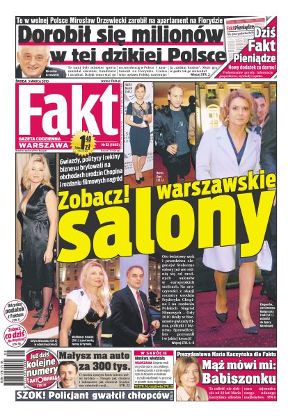 Mirosław Drzewiecki ma na Florydzie apartament wart prawie milion, dom pod Łodzią za 345 tys., działki wycenione na 1,5 mln i 1,9 mln złotych na kontach; w Warszawie jednego wieczora rozdano Orły i świętowano 200-lecie urodzin Chopina; Kamila Łapicka, żona słynnego aktora dostała pracę dzięki mężowi; po Grażynie Torbickiej w ogóle nie widać upływających lat; Borys Szyc boi się o swoją córeczkę; dziś nasza reprezentacja zagra w strojach, które pasują do USA bądź Francji, ale nie do Polski; kapelan Cracovii czytał piłkarzom „Fakt” z ambony; Artur Boruc dostanie swoją szansę i powróci do reprezentacji Polski.