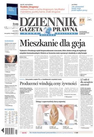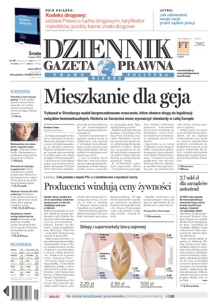 Trybunał w Strasburgu wydał bezprecedensowe orzeczenie, które otwiera drogę do legalizacji związków homoseksualnych; osoby krytykujące przepisy o przeciwdziałaniu przemocy najczęściej ich nie znają; szefowi resortu finansów nie udało się przekonać prezydenckiej rady do pomysłów rządu Donalda Tuska; Transparency International dowodzi, że rocznie greckie gospodarstwa domowe wydają na łapówki prawie 800 mln euro; Rosjanie chcą dowodów, po tym jak były szef służb specjalnych oświadczył, że na Litwie działa trzy tysiące agentów Moskwy; Kolumbia Brytyjska będzie się rozwijała gospodarczo najszybciej ze wszystkich prowincji Kanady.