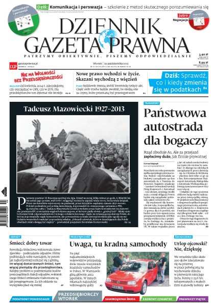 Zmarł Tadeusz Mazowiecki, pierwszy premier III Rzeczypospolitej; autostradę A1 zbuduje specspółka, która dostanie wolną rękę w kształtowaniu wysokości opłat; tylko 10 proc. samozatrudnionych płaci składkę wyższą od minimalnej.