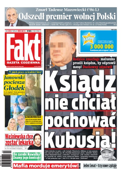 Zmarł Tadeusz Mazowiecki, pierwszy premier III RZeczypospolitej; ksiądz odmówił pochowania zmarłego dziecka; w piątek odbędzie się proces w sprawie kradzieży futer, w którą zamieszana jest żona Roberta Janowskiego, Monika Głodek.