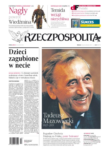 Zmarł Tadeusz Mazowiecki, pierwszy premier III Rzeczypospolitej; co dziesiąty nastolatek uzależniony jest od internetu – zaniedbuje szkołę, bliskich i żyje w wirtualnym świecie; pomysł jawnego ubiegania się o fotel szefa Komisji Europejskiej może się nie udać – sprzeciwiła się Angela Merkel.